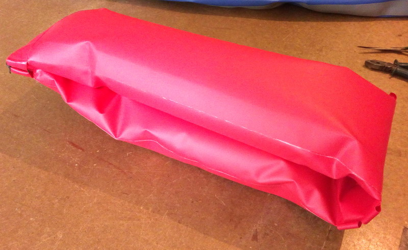 Самая простая спинка для байдарки. Надувная труба, согнутая пополам, и имеющая 8 петелек для крепления. Такая спинка хорошо подпирает спину в нужном месте, легко накачивается ртом или насосом, не занимает места при складывании байдарки. Спинка привязывается к петелькам, через которые продет ликтрос. Также можно заказать отдельные силовые элементы (петли), которые вы сможете приклеять к байдарке для более удобной привязки спинки.